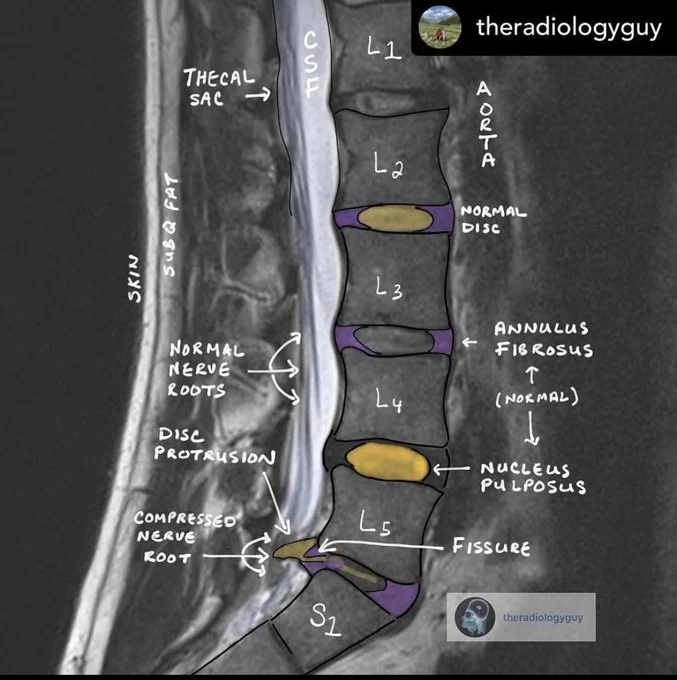 Хороший визуальный учебник по анатомии поясничного отдела МРТ и как тейпирование помогает при разрыве хрящевого кольца, защемлении диска, травмировании остеофитами.